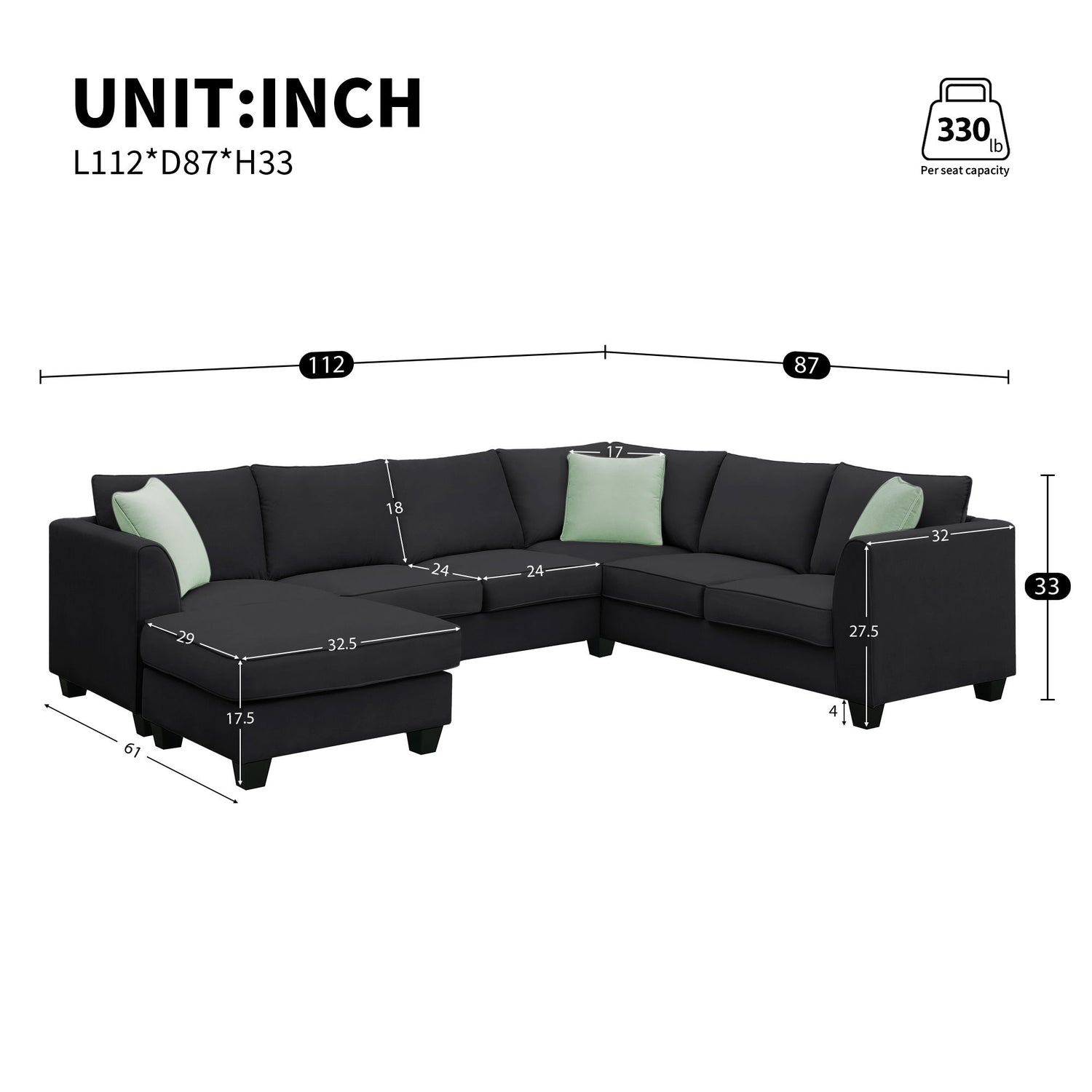 112.0"W x 87.0"D x 33.0"H - 225.75 lb