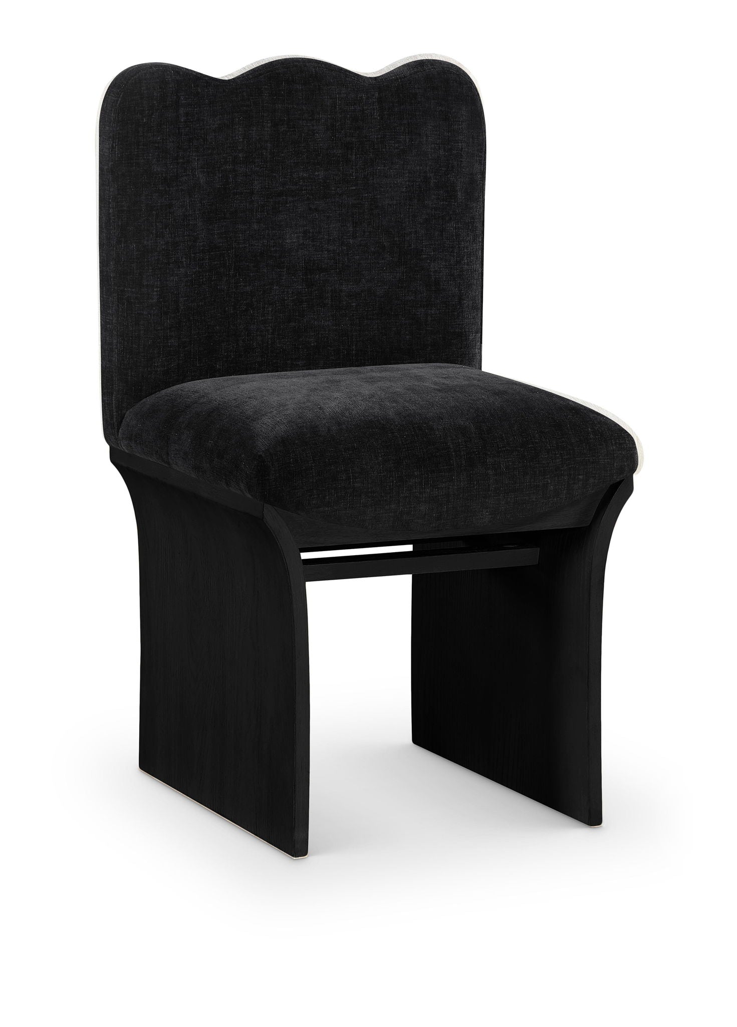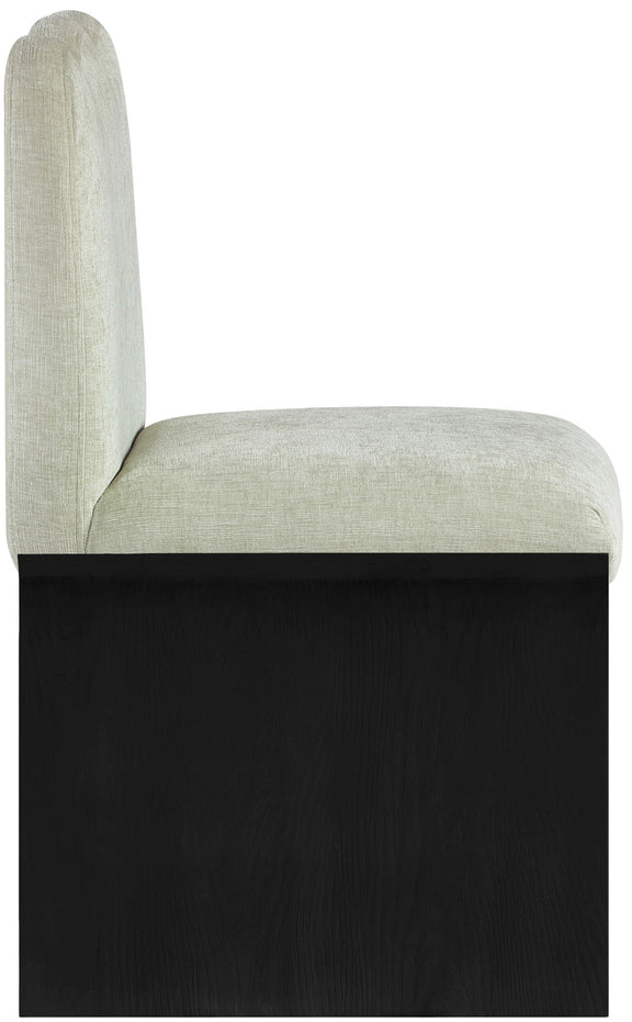 Sculptural curves and plush cream chenille transform the Shaw dining chair into a show-stopping statement piece. Anchored by a black oak veneer base, this art deco-inspired chair radiates bold sophistication. Elevate your dining space with a striking blend of comfort and couture-worthy style.