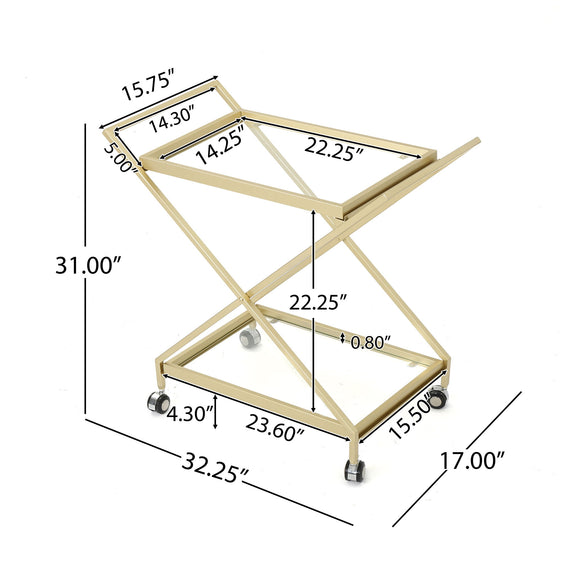 Sherianne - Industrial Bar Cart With Tempered Glass Shelves And Swivel Wheels - Gold