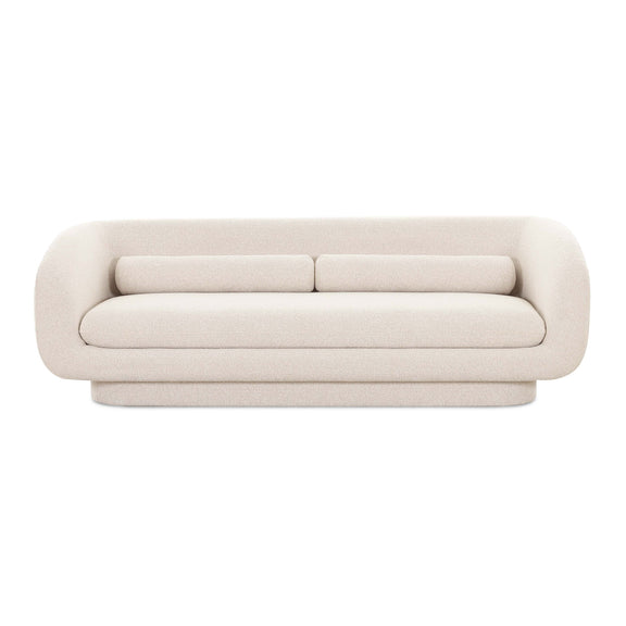 Refined comfort meets contemporary design with the Simone Cream Boucle Sofa. Upholstered in durable, easy-to-clean cream boucle fabric, this sofa features two chic bolster back pillows for added style and support. Its sleek plinth base adds a modern touch, making this sofa a statement piece that transforms any living space into a haven of sophistication and relaxation.