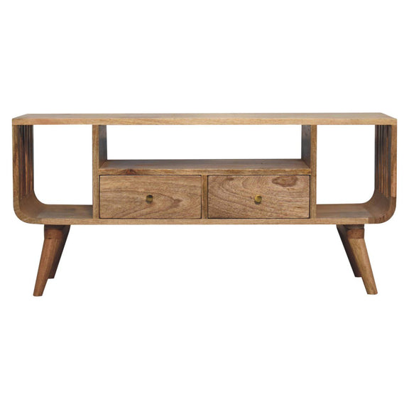 - Soba Nordic Multi Media Unit - This Soba Media Unit has been constructed from 100% solid mango wood and has a lovely natural oak-ish finish. It features a unique ridged design on either side of the piece, t-bar handles, as well as 4 Nordic style legs for stability and a modern touch. Make full use of this piece in your living room or hallway and let it take care of storing all your belongings.