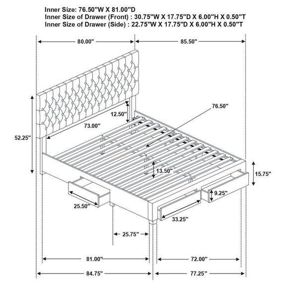 This stylishly practical wood storage bed from the Soledad Collection features a clean, convenient design. It features Asian hardwood, poplar, and MDF construction and is mattress-ready (no box spring required). Bed includes four spacious drawers on rollers. An elegant button tufted headboard imparts classic sophistication. Luxuriant fabric upholstery conveys a soft allure.
