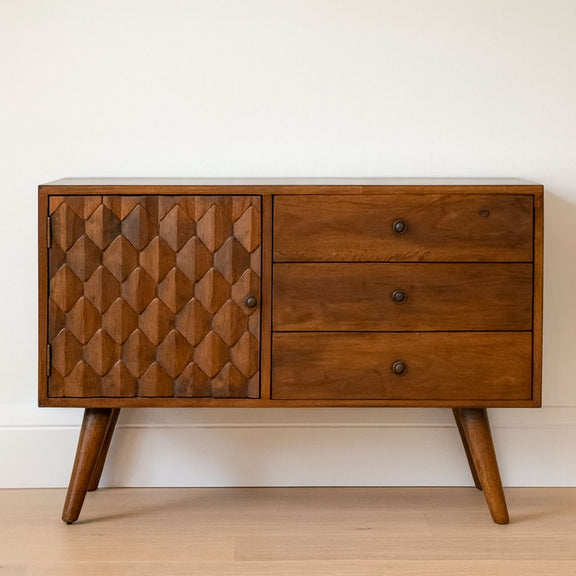 • Carved Sideboard - Enjoy this sideboard in your bedroom or living room, constructed from 100% solid wood in a finish, it features 4 Nordic style legs with 3 deep drawers and 1 cabinet to take care of everyday utility items. The main feature of this product is the raised carved door front which adds a nice touch to the product and will add lasting character to your home.