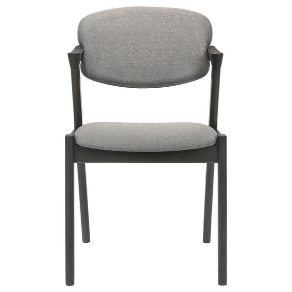 - Designed with a padded backrest and seat, each upholstered in a brown-toned grey fabric, this chair offers a place of rest at a dining table and beyond