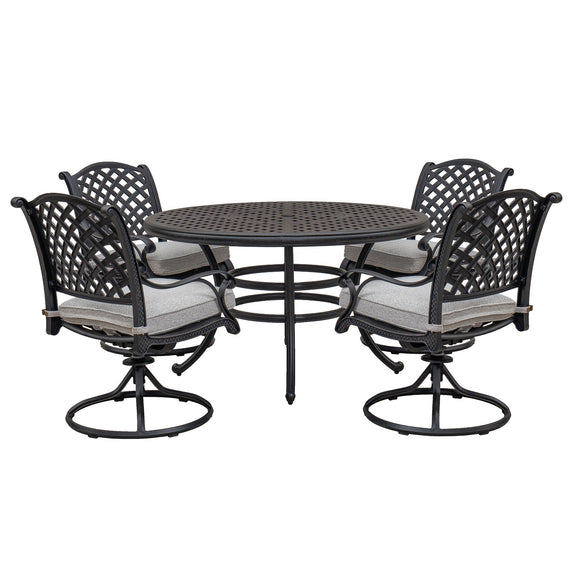 - 5-Piece Dining Set: Versatile set with four swivel chairs and a round table. Features a 2-inch umbrella hole for shade. Ideal for outdoor gatherings and patio dining.