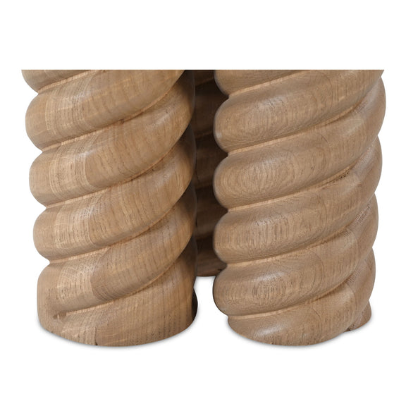 Gillian Segal for Moe's The Treccia side table embodies a contemporary reinterpretation of classical aesthetics, distinguished by its intricate turned and braided details. The table features an exaggerated, elegantly detailed pedestal base, presenting a bold modern twist while ensuring practicality. Its pedestal design is visually appealing and enhances functionality, creating a welcoming, uncluttered space for gatherings and everyday use.