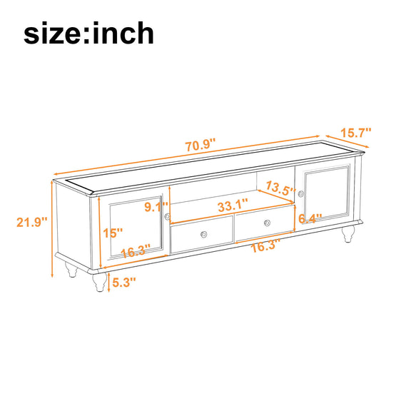 • Thoughtful Design: With 2 large cabinets, 2 drawers, and open compartment, this TV stand keeps media devices, collections, and decor neatly organized.