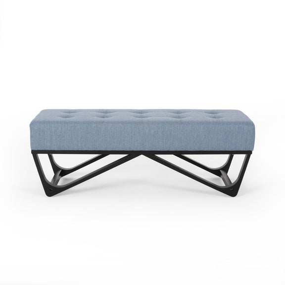 Upholstered Ottoman With Button Tufted Waffle Stitch And Black Geometric Legs - Light Blue