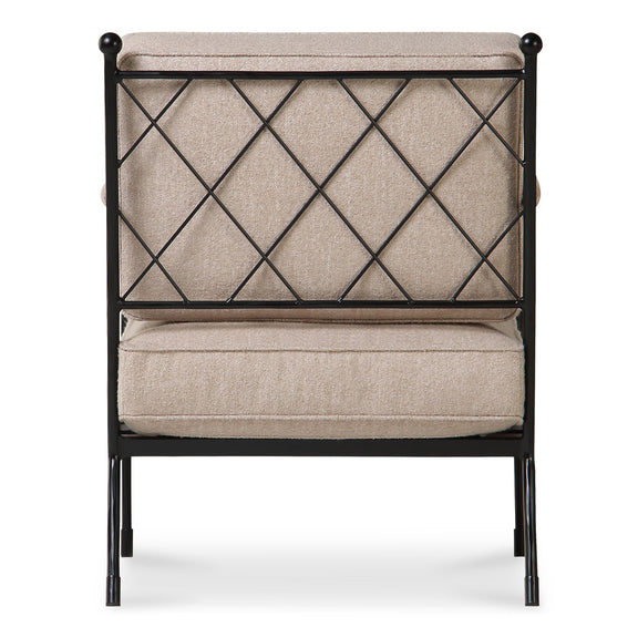 Gillian Segal for Moe's The Vecchia accent chair draws its inspiration from the revered ambiance of Italy's Posta Vecchia hotel, blending timelessness with understated elegance. Crafted with a hammered metal finish, its iron frame showcases a unique lattice detail on the back, crowned with a decorative finial, paying homage to historic Italian craftsmanship. The chair's upholstered seat, complemented by refined piping detail, speaks to comfort and an easy-to-maintain aesthetic grace.