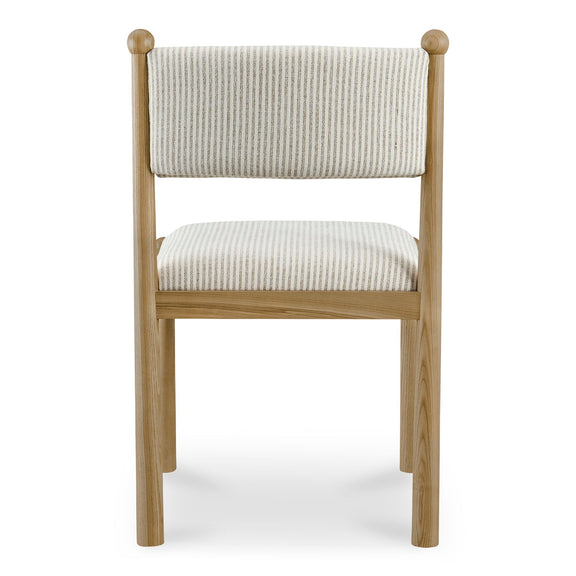 Gillian Segal for Moe's The Villetta dining chair echoes timeless allure. Showcasing classic stripes, each curve tells a story of heritage and finesse. Its warm, stained frame and whimsical finial touches draw inspiration from the vintage elegance of the '60s and '70s.