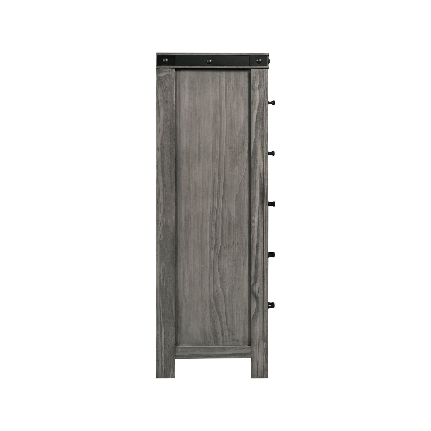 The Wade 5-Drawer Chest is the ultimate chest for your home! This chest comes with five, spacious drawers; perfect for easily keeping all of your belongings neatly stored away. The bottom drawer features a dust proofing layer to help protect your belongings. The drawer pulls and trim along the top of the chest are both metal with a black finish. Along the trim on the chest are decorative bolts, adding a little extra flair. This chest is finished in a neutral gray, making it easy to pair with any existing decor or to find an excuse to completely redo your bedroom. Please note wood grains vary piece by piece and will not look exactly like the picture.