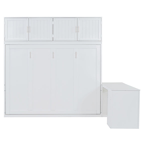 Queen Size Wall Murphy Bed With Desk And Storage Shelves And Big Cabinets - White