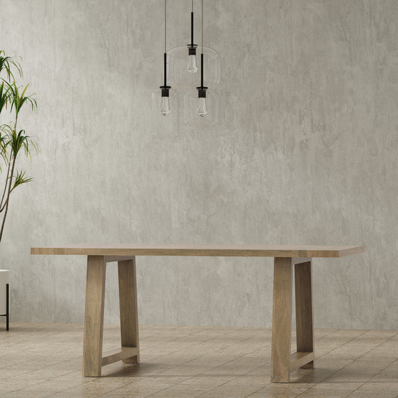 - The thick, rectangular tabletop is made with sustainably sourced solid mango wood in a Grey Wash finish and perpendicular panels on the short sides for visual contrast.