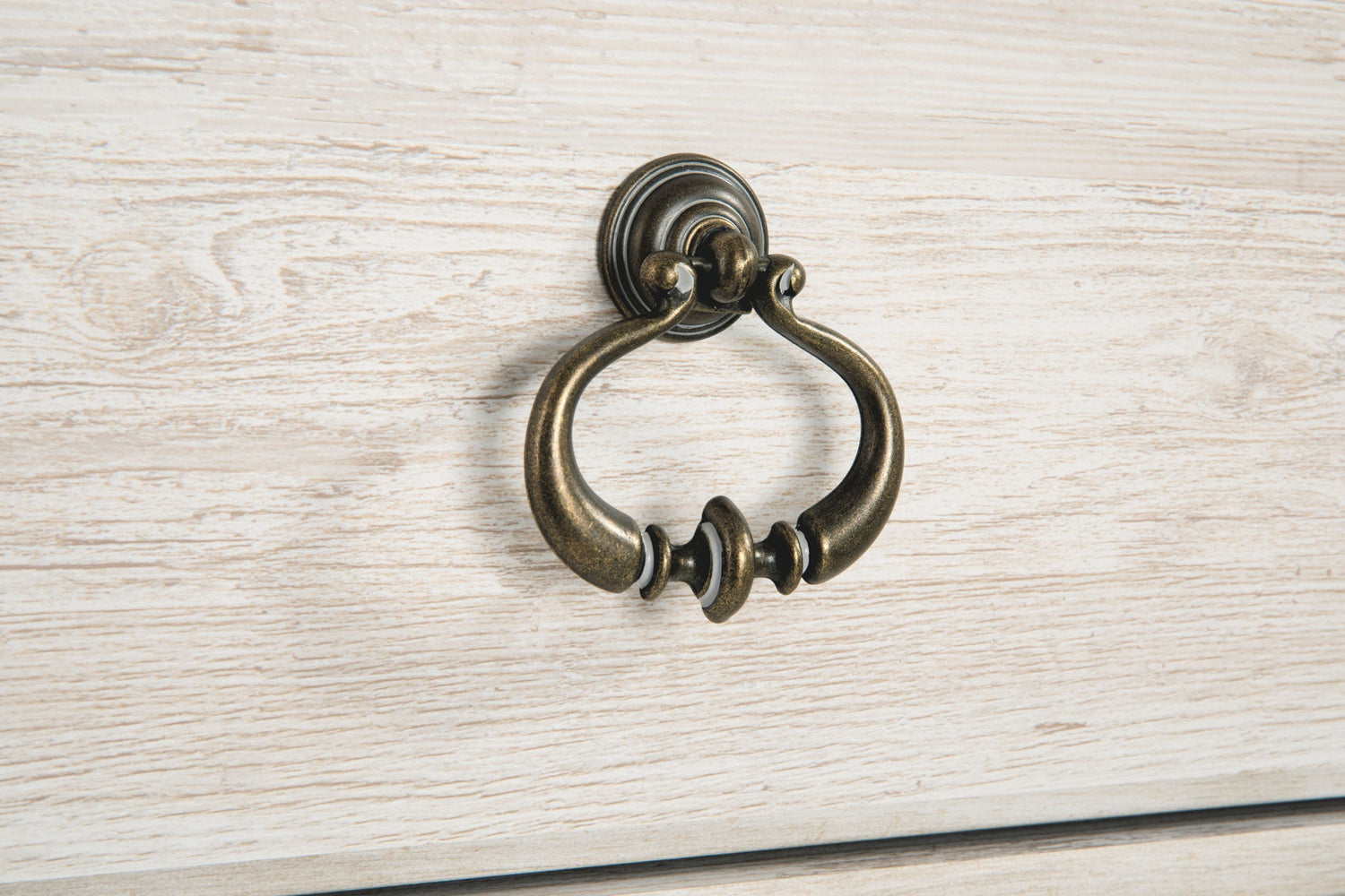 Two-tone finish in white wash replicated worn through paint with authentic touch and a replicated wood grained block pattern with authentic touch. Large scaled shapely bedroom collection features bun feet. Ring pull hardware in an antique brass color, accented with white paint hang up. Side roller glides for smooth operating drawers. Slim profile dual USB charger located on the back of the night stand tops. Queen (57) panel headboard can attach to bolt-on metal bed frame B100-31. Queen (57) panel headboard is capable of attaching a full sized metal bolt on bed frame. Queen (77) and king (78) headboards can attach to a bolt-on metal bed B100-31 or B100-66 respectively. B267-48 has a sliding door over open shelves and five drawers of storage. Safety is a top priority, clothing storage units are designed to meet the most current standard for stability, ASTM F 2057 (ASTM International). Drawers extend out to accommodate maximum access to drawer interior while maintaining safety.