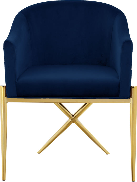 Spread elegance and modernity to your dining room with this Xavier velvet dining chair from Meridian Furniture. This beautiful chair features a simple barrel seat with a plush cushion and back, ensuring that every meal is a comfortable one. The steel legs provide durable support while you sit, and an "X" leg in the back lends the chair an uber-modern vibe. finishing on the base is sleek and chic, giving this chair a contemporary edge that's well at home in any modern dining room. Sleek velvet upholstery is durable and tough yet soft against your body, elevating meal times to a luxurious experience.